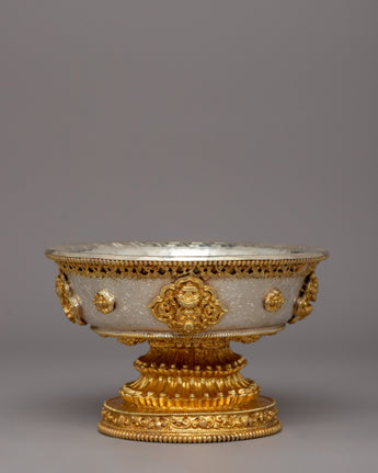 One of the main rituals in Buddhist ceremonies, devotional offering, is symbolized by the Serkyem Set in Buddhist symbolism. This set's offering bowls are used to ask for divine benefits; each offering represents thankfulness, purity, and the removal of barriers. While the silver plating raises the object's spiritual vibration, the gold plating represents the object's noble and enlightened state. With its two-tiered structure, the set's design might be seen as symbolizing the dual character of the Buddhist path, which is compassion and wisdom, both of which are necessary for enlightenment and spiritual development.