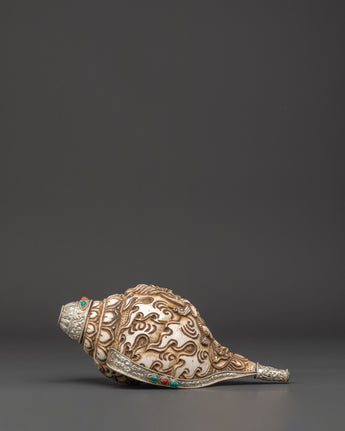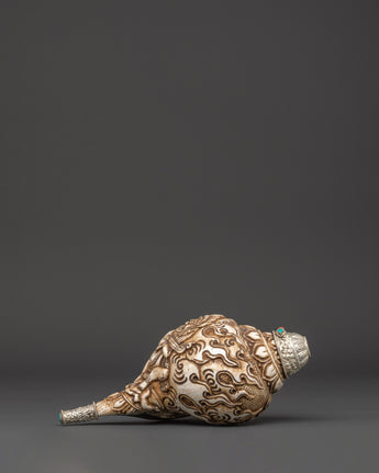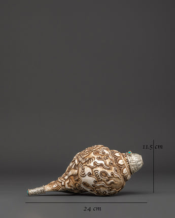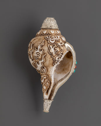 This Ritual Tool Conch Shell, measuring 11.5cm in height and 24cm in width, is a remarkable blend of natural beauty and spiritual significance. Handcrafted with meticulous care, it features a finely carved deity figure that transforms the conch into a sacred artifact used in meditation, healing practices, and spiritual rituals. Surface enhances its natural elegance, making it not only a decorative piece but also a powerful symbol of spiritual balance and enlightenment. Ideal for your altar or meditation space, this conch shell invites positive energy and deepens your connection to sacred traditions.