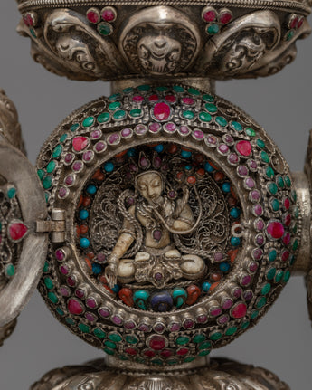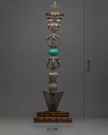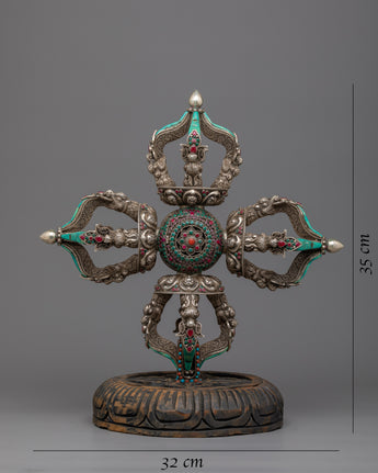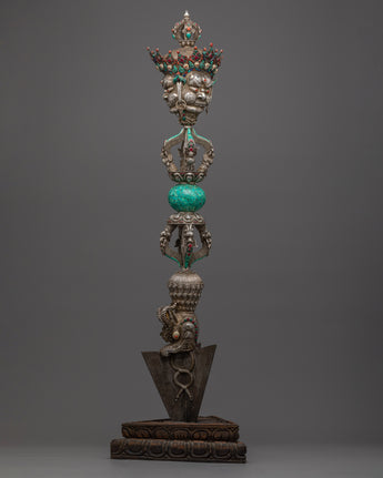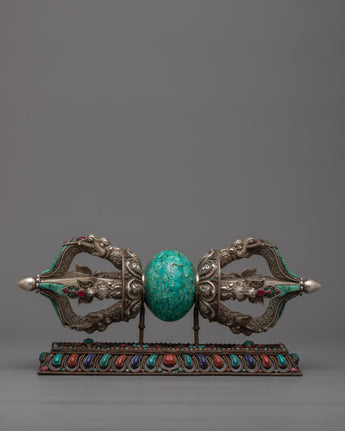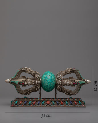 Introducing the Phurba, Vajra, and Double Vajra Ritual Set - a stunning collection meticulously handcrafted on exquisite silver. Elevate your spiritual practices with this divine trio, complete with a stand for effortless display. Each piece in this set is adorned with the finest coral, Irani, and lapis lazuli stones, radiating a powerful aura of enlightenment and harmony. Immerse yourself in the sacred energy of this ritual set, designed to enhance your spiritual journey and awaken your inner wisdom. Experience the transformative power of the Phurba, Vajra, and Double Vajra - embrace ancient traditions and embark on a path of spiritual awakening. Elevate your rituals with this extraordinary set today!
