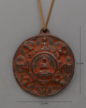 This handcrafted Buddhist brass Buddha locket is a stunning combination of artistry and spiritual heart. This locket has a round form and measures 8.5 cm in height and 7.5 cm in breadth, weighing 0.15 kilogram. The centerpiece has a detailed Buddha design surrounded by spiritual symbols, which are brought to life with an old oxidized brass finish.
