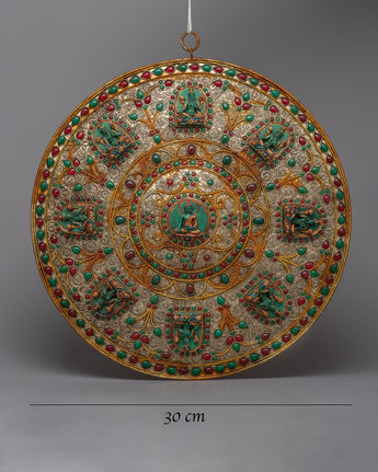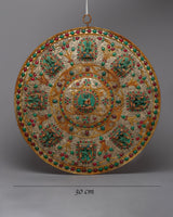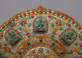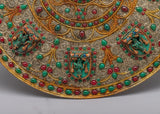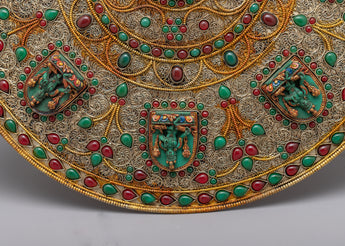 The Round Mandala is a work of art that has been painstakingly constructed on a copper body with superb silver and 24k gold plating. This magnificent artwork features complex details and craftsmanship that are a true testament to the artists' talent. A Deity is expertly created in the middle of the mandala, capturing the essence of divinity and spirituality. The mandala is embellished further with placed gemstones, which lend a touch of sparkle and elegance. This ancient symbol is rich in symbolism and serves as a focal point for meditation and spiritual reflection. The Round Mandala is not only an aesthetic treat, but it also represents cosmic harmony and spiritual transcendence.
