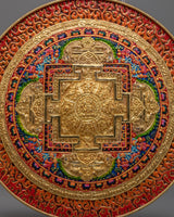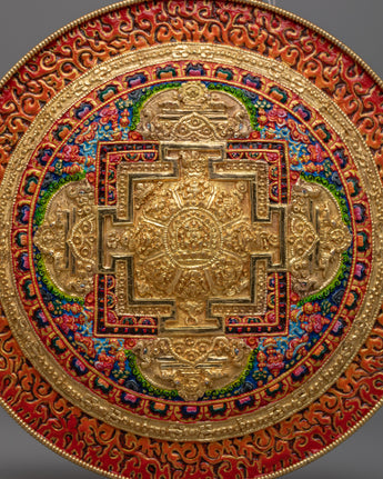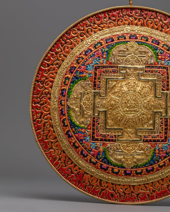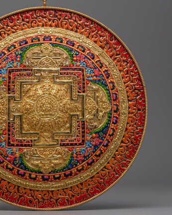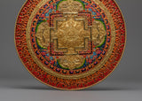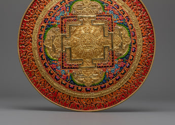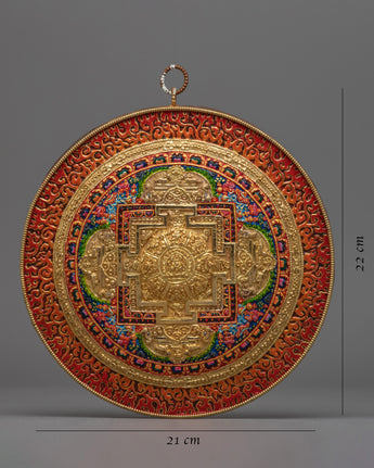 Handmade on a copper body and exquisitely gold plated, this magnificent round mandala wall art is a wonderful monument to the beauty of traditional craftsmanship. Vibrant acrylic paints bring the complex mandala design to life, resulting in an eye-catching sculpture that exudes spiritual energy and warmth. The gold plating and the vibrant mandala pattern add a touch of luxury and sophistication, making it an ideal addition to any house or hallowed area.