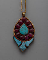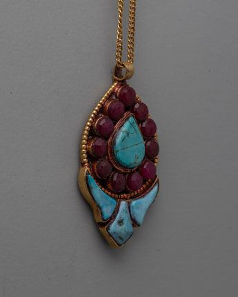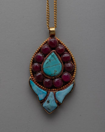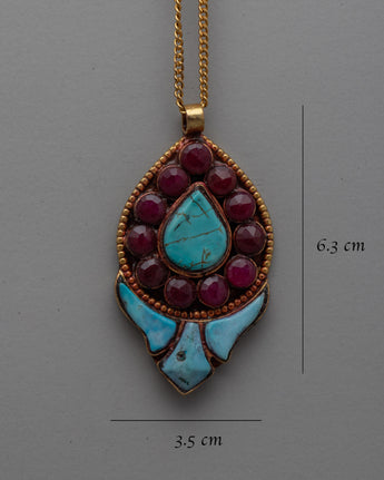 Presenting the Ruby Gemstone Pendant, a stunningly made item that epitomizes grace and masterful artisanal craftsmanship. This magnificent pendant embodies real style, crafted with copper and embellished with opulent electrogold plating. Semi-precious stones, such as a vivid ruby and stunning turquoise, are inlaid into the pendant to lend a rich, colorful dimension to the design and to create a dramatic contrast.