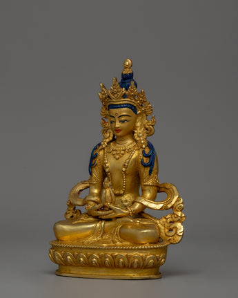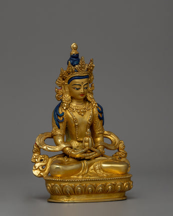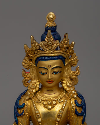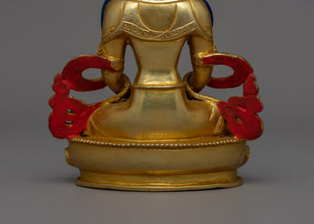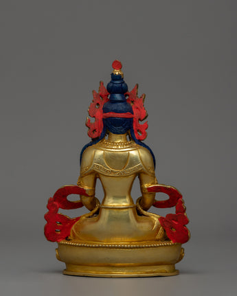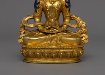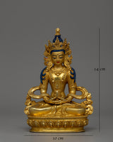 Amitayus is shown seated in intense meditation, holding the sacred Kalasha (long-life vase) carrying the nectar of immortality (Amrita). His beautiful crown and flowing robes represent his enlightened nature and divine power. The bright gold plating enhances his spiritual presence, making this statue a powerful symbol of inner calm, longevity, and wisdom. In Tibetan Buddhist traditions, Amitayus is invoked through prayers and ceremonies to eliminate obstacles to long life, provide healing energy, and increase spiritual awareness. This gorgeous sculpture is a reminder of inner power, spiritual wisdom, and the infinite benefits of an awakened existence.