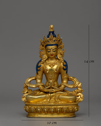 Sacred Amitayus Buddha, the Tibetan Buddhist god of longevity and knowledge, is believed to provide long life, health, and spiritual wealth. This electro gold-plated copper statue is 14 cm (height) x 10 cm (width) and was handmade to complement your meditation space, sacred altar, or spiritual collection. Weighing 0.50 kg, this intricately sculpted figure represents peace and divine advantages, making it an excellent offering, present, or personal spiritual treasure.