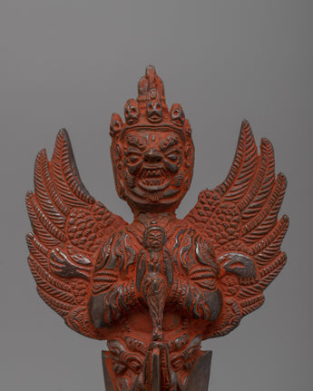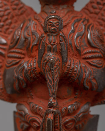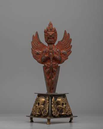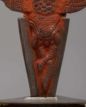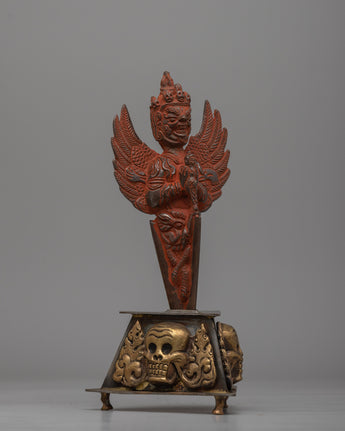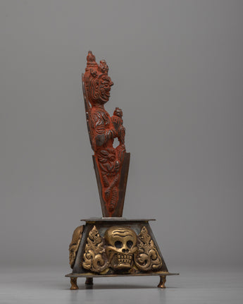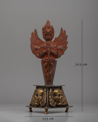 This Phurba has a powerful deity on top, representing the power to overcome ignorance and negativity. The deity's face, framed by powerful wing-like elements, symbolizes protection and divine speed in overcoming challenges. The base is decorated with carved skulls, representing the transition of fear and ego into spiritual wisdom and release. The Phurba, which is widely utilized in Vajrayana Buddhist rituals, is an effective weapon for eliminating negative energies, evoking protection, and establishing spiritual focus. Its iconography and craftsmanship make it a powerful symbol of the path to enlightenment.
