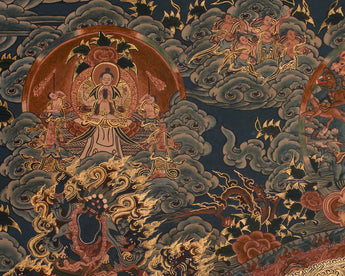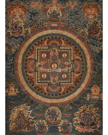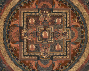 At the center of this Sacred Buddha Mandala, the Buddha sits peacefully within the cosmic circle, symbolizing enlightenment as the foundation of harmony. Around him are highly detailed deities, each representing different facets of compassion, wisdom, and protection. The mandala's symmetrical design reflects the universe—a sacred map guiding viewers toward inner tranquility and awakening. Every element, from the radiating lotus petals to the outer protective rings, holds deep symbolic significance, transforming this thangka into not just a visual masterpiece but also a meditative tool for spiritual reflection.