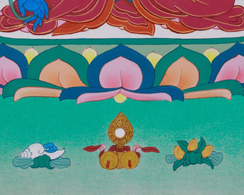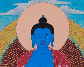 Our Buddha Medicine Thangka is a hand-painted artwork on cotton canvas, featuring vibrant colors and genuine 24K gold accents. The traditional Karma Gadri style brings the Buddha Medicine to life with its rich hues and radiant gold, highlighting his healing energy.