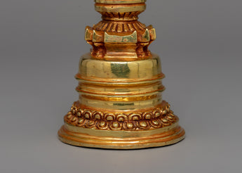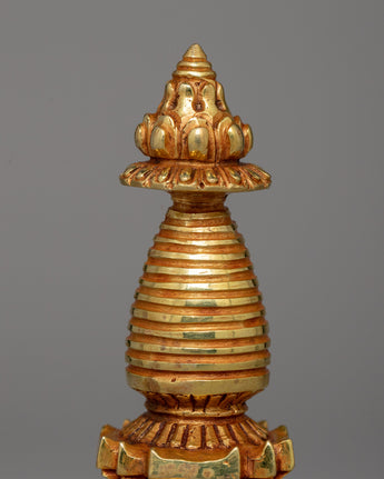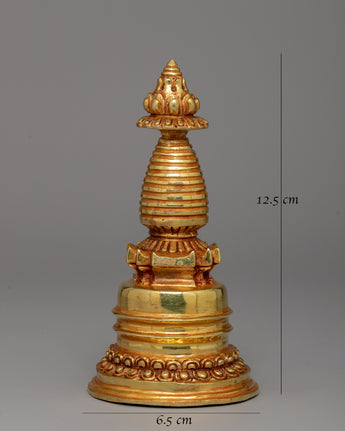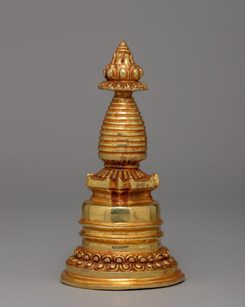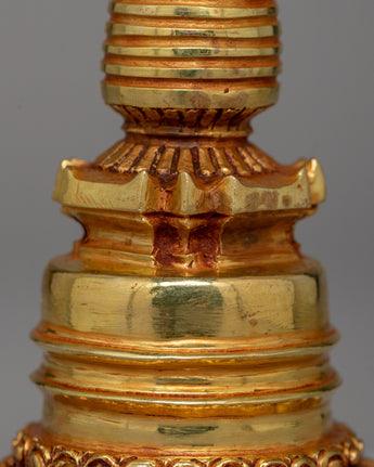 This treasured Buddhist Stupa for Meditation represents enlightenment, tranquility, and the journey to awakening. This delicately carved stupa, made of copper and gold-plated, is a potent meditation tool that radiates divine blessings and spiritual energy. Stupas have traditionally represented the Buddha's enlightened knowledge and served as an attraction for meditation and devotion.