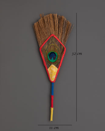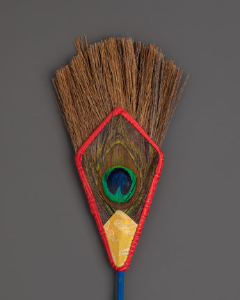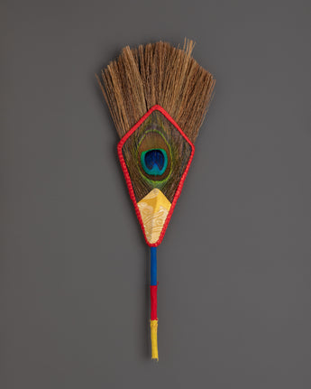 This ritual broom, made with care, combines bast fiber with a stunning peacock feather centerpiece, which is widely adored in Buddhist tradition as a symbol of compassion, vision, and divine protection. Its lightweight construction allows for simple handling during ceremonial use, while the bold, elaborate wrapping adds to the authentic and traditional atmosphere of your spiritual practice.