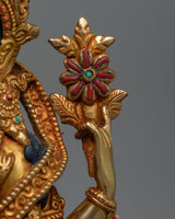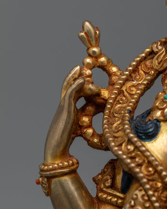 The sacred Chenrezig Buddha statue is carefully plated in 24K gold, with elaborate gold and acrylic paintings emphasizing Chenrezig's tranquil look and beautiful nuances. The statue's copper body is embellished with hand-carved gemstones, bringing a fantastic touch of religious creativity to the spiritual figure. The statue's tiny base, which is 6.7 inches broad, makes it ideal for personal altars, meditation places, or as a meaningful present for a loved one.