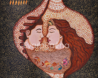 This artwork illustrates the interconnection of life and cosmic cycles by combining opposites such as masculine and feminine, energetic and passive. The complex water and fish features evoke prosperity and emotional depth, while the hanging lamp represents divine wisdom and guidance. Set on a timeless black background, this canvas is a powerful celebration of love, balance, and spiritual awakening.