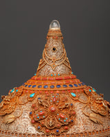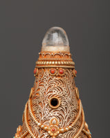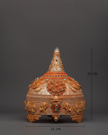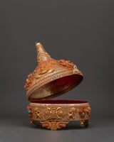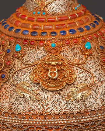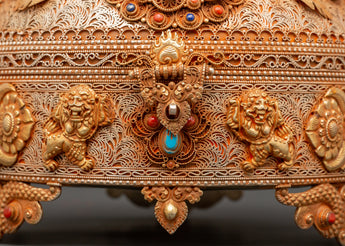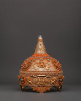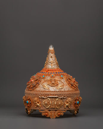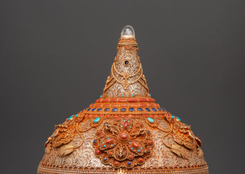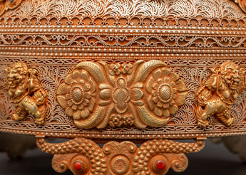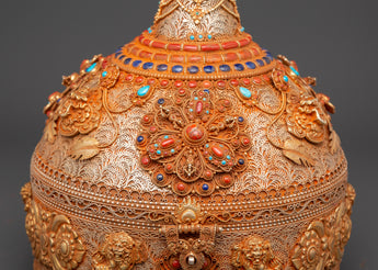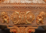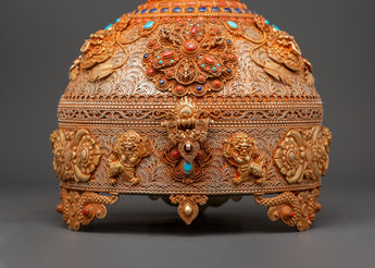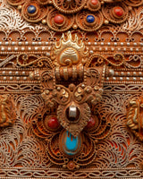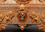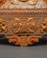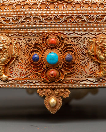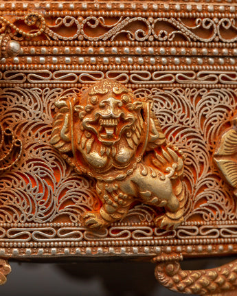 This Sacred Copper and Gold-Plated Treasure Chest is beautifully crafted to serve as both a spiritual heirloom and a functional ceremonial storage option. Its copper body, which is 30 cm tall and 25 cm wide, has a gentle tone that is delicately emphasized by shining gold-plated details. The lid and panels are decorated with intricate floral engravings that represent development, renewal, and the blossoming of consciousness. At each corner, guardian lion designs stand sentinel, poised to symbolize protection, strength, and bravery. Inlaid with coral and turquoise stones, these pieces add a burst of brilliant color and metaphysical power. Turquoise promotes healing and balance, while coral awakens vigor and heart-centered courage.