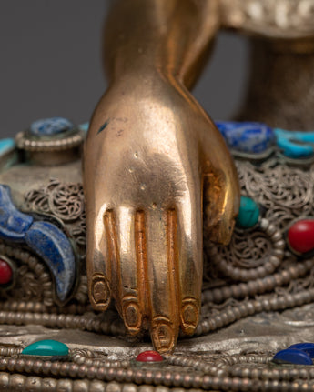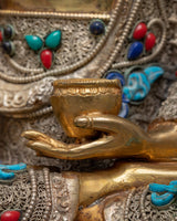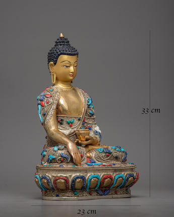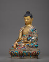 The Sacred Copper Shakyamuni Buddha Statue, meticulously handcrafted from a copper body, is the height of artisanal excellence. This exquisite artifact is then adorned with sophisticated silver plating, which creates a radiant backdrop that beautifully highlights its divine contours. The statue is further embellished with a 24k gold gilding, demonstrating an unparalleled commitment to craftsmanship by meticulously highlighting the intricate details and revered symbols associated with Shakyamuni Buddha, the symbol of enlightenment.