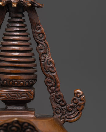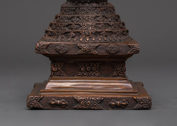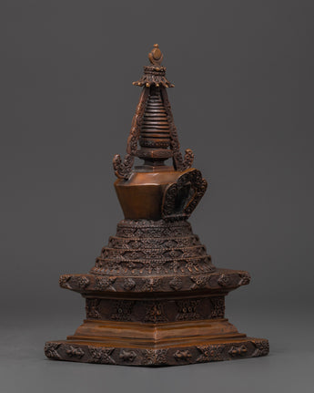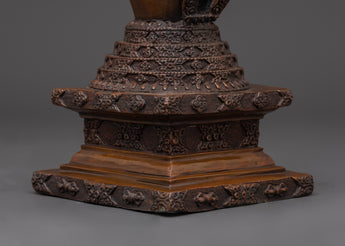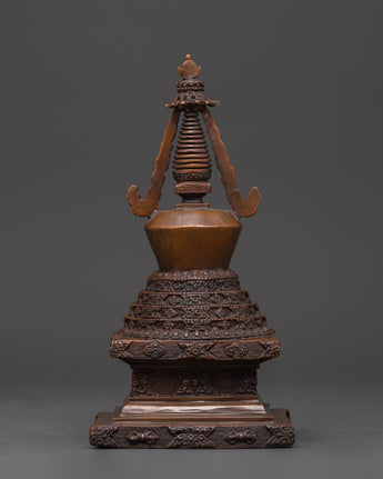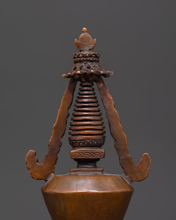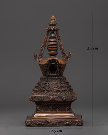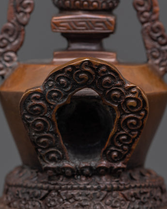 The oxidized copper body enhances the spiritual presence of the piece, representing both grounding energy and divine wisdom. Its design, with clean lines and copper tones, makes it a striking and meaningful addition to any home or sacred space. Whether used in meditation practices, placed on your altar, or displayed as a sacred art piece, this stupa brings peace, focus, and tranquility into your environment.