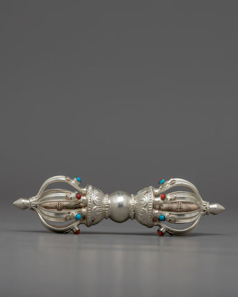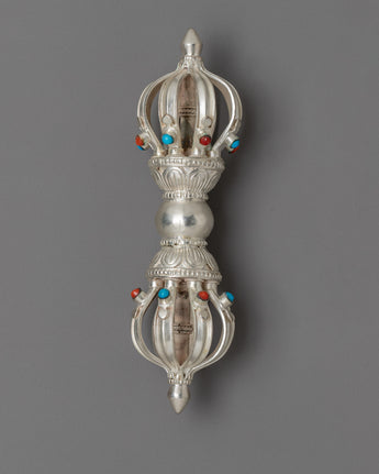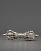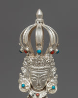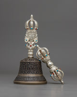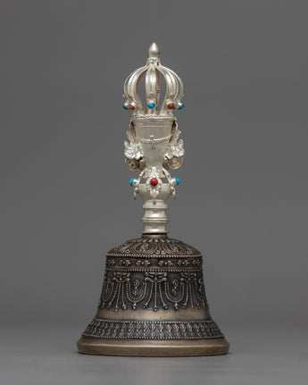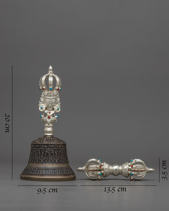 The bell's handle and vajra are silver-plated, which highlights the fine details and lends a sophisticated touch to the design. Silver plating, which is frequently utilized in Buddhist rituals and ceremonies, not only improves the items' aesthetic appeal but also increases their ritualistic significance.