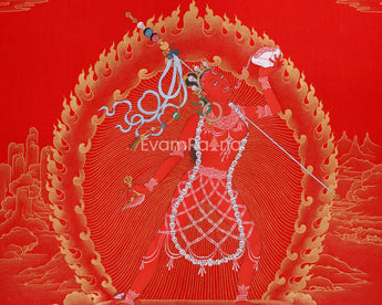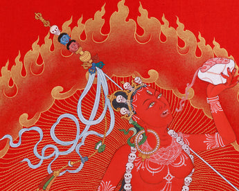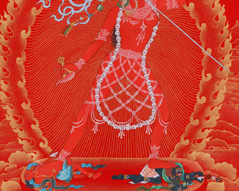 With deep spiritual power, this stunning Dancing Goddess Vajrayogini thangka is carefully hand-painted on a sacred cotton canvas. It boasts bright acrylic colors and genuine 24K gold, created in the revered Nakthang tradition—gold on red. The bold red background symbolizes ultimate wisdom and passion transformed into enlightened awareness. The gold lines shimmer with transcendent clarity, creating a divine interplay of wrath and beauty. Every sacred detail, her skull cup, bone ornaments, and curved vajra-handled knife—has been meticulously rendered, evoking both reverence and awe. The rare and highly revered Nakthang style amplifies the visual and energetic impact, making this thangka a potent object of meditation and tantric practice.