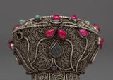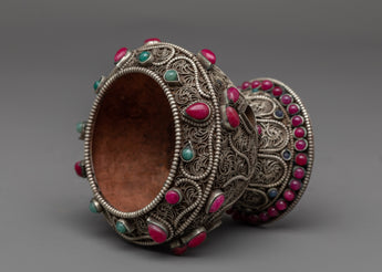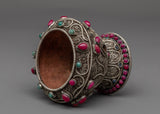 The Sacred Dhupur Rice Pot is a finely crafted piece made from copper, adorned with intricate details and artistry. The pot's design is enhanced by the presence of artificial stones meticulously inlaid, adding a touch of elegance and visual appeal to its overall appearance. With its radiant copper body and embellishments, this rice pot serves not only as a functional vessel but also as a captivating work of art that carries the essence of craftsmanship and devotion. Whether used for its intended purpose or displayed as a symbol of cultural heritage and aesthetic appreciation, the Sacred Dhupur Rice Pot embodies the fusion of artistic creativity and practical utility.