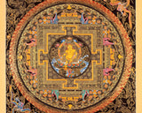 Dzambala Mandala is a sacred artistic representation within Tibetan Buddhism that centers around the deity Dzambala, who embodies wealth, prosperity, and abundance. In this intricate and symbolic visual arrangement, Dzambala occupies the central position, surrounded by a meticulously designed pattern of symbols, and geometric forms. This mandala serves as a focal point for meditation, contemplation, and devotion, channeling the energies of wealth and blessings that Dzambala represents. The mandala's complex symbolism is a reminder of the interconnected nature of material and spiritual prosperity, and engaging with it can evoke positive intentions and actions toward achieving both inner and outer abundance.