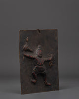 Every element of the guardian god is carefully crafted, from the expressive face to the dynamic attitude, to portray the protective energy venerated in esoteric Buddhist traditions. This figure is frequently linked with repelling negativity and protecting sacred locations. The plaque's tough patina and texture give it an archaic, ritualistic quality, tying it to traditional Himalayan craftsmanship and sacred practice. The hook at the top allows for simple hanging in homes, studios, or temples.