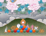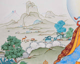Immerse yourself in this captivating Guru Rinpoche thangka, connecting with the profound wisdom and blessings of Padmasambhava as you embark on your personal spiritual journey. This magnificent thangka is painted with genuine 24k Gold and stone colors, where tranquility envelops us in a serene landscape adorned with a splendid lotus emerging from a vast lake. The lotus symbolizes the triumph of positivity, transcending the realms of negativity. Guru Rinpoche, seated gracefully on a lotus seat, holds a powerful 9-pronged vajra in his right hand, signifying his mastery over spiritual practices and his ability to overcome obstacles. In his other hand, he carries a skull cup, representing the transformative process of turning ignorance into wisdom. Adorned with a lotus hat and supported by a trident, Guru Rinpoche's spiritual prowess is further emphasized.