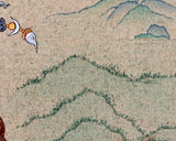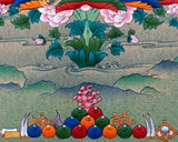 Experience the profound practice of Sacred Guru Rinpoche with this exquisite hand-painted thangka, meticulously created for mantra recitation and devotion. Guru Rinpoche, the revered Vajrayana Buddha, sits serenely upon a lotus, holding a vajra in his right hand and a skull cup in his left. The thangka depicts lush slopes and cascading waterfalls, flowing into a tranquil lake adorned with blooming lotus flowers. Symbolically, Guru Rinpoche's white inner clothing represents the radiant clarity of the mind, while the brown outer garment signifies the spirit of self-sacrifice. Every intricate detail of this artwork captures the essence of Guru Rinpoche's teachings, inviting practitioners to establish a profound connection with his wisdom and blessings. Embark on a transformative journey and deepen your spiritual practice through this remarkable thangka, which beautifully reflects the rich spiritual heritage of Vajrayana Buddhism.