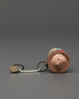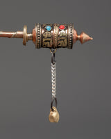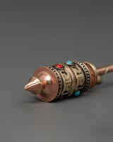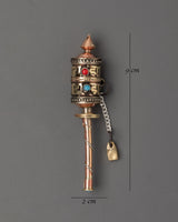 The Sacred Mantra Engraved Prayer Wheel is a stunning, handcrafted Tibetan spinning wheel designed to promote mindfulness, calmness, and positive energy. This prayer wheel is crafted from copper and features brass accents. It is also ornamented with turquoise stones, which offer both beauty and spiritual value. Its dimensions are 9 cm tall and 2 cm wide, making it ideal for any meditation place, altar, or spiritual decor. Engraved with the famous "Om Mani Padme Hum" phrase, this prayer wheel is an effective tool for meditative rituals, amplifying your aspirations with each turn.