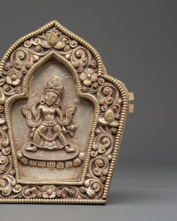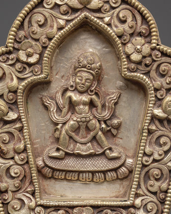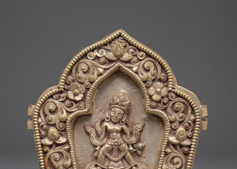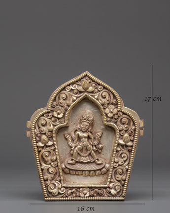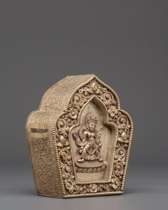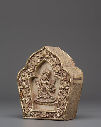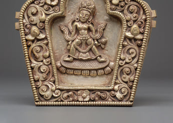 With its removable lid, divided into three parts, the Ghau Box provides a secure and meaningful space for storing sacred objects, amulets, or relics. The box’s elegant silver-plated copper finish and its detailed deity motif make it a perfect addition to any spiritual collection. This box is not only a protective item but also a beautiful representation of divine energy and blessings, ideal for anyone seeking to enrich their spiritual journey with an element of sacred tradition.