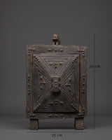 This Sacred Shakyamuni Buddha in a Wooden Box is a remarkable Tibetan Buddhist shrine, handcrafted entirely from wood and created to preserve and honor the spirit of devotion. Measuring 39 cm in height and 25 cm in width, and weighing 3 kg, it carries an aura of sacred presence. The exterior is enhanced with layered carvings, flowing border patterns, and jewel-like accents in deep red and green tones. A guardian lion rests atop the shrine, a symbol of watchfulness and protection in Himalayan tradition.