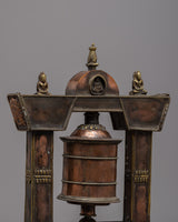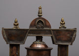 The Sacred Single Prayer Wheel is a captivating work of art meticulously handcrafted from a blend of copper and brass. At its crown, a finely detailed stupa is exquisitely formed, symbolizing the enlightened mind. Flanking the stupa on both sides, intricately crafted deities radiate an aura of divine grace. As this prayer wheel is spun, the spiritual energy and blessings encapsulated within the mantra are unleashed, enveloping the surroundings with a sense of tranquility and positive vibrations. This masterpiece serves as a remarkable embodiment of artistic skill and spiritual devotion, making it a cherished item for both aesthetic appreciation and meditative practice.