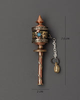 The Sacred Spinning Wheel is a handcrafted brass Tibetan prayer wheel decorated with turquoise stones and the powerful Om Mani Padme Hum mantra. This small sculpture, carefully crafted by professional artisans, measures 7.5 cm in height and 2 cm in width, making it ideal for personal altars, meditation nooks, or spiritual shelves. The body features beautiful brass workmanship and inlaid turquoise, representing protection and spiritual healing, while the smooth-spinning mechanism activates blessings and purpose with each turn.
