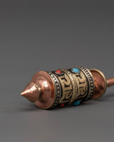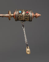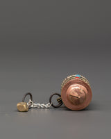 Connect with the essence of Tibetan spiritual practice with this 9cm sacred Tibetan Buddhist Prayer Wheel, which is carved from copper and brass and embellished with turquoise and coral stones. This sacred spinner, weighing only 0.012 kg, is suitable for meditation, practice of mindfulness, and ceremonial offerings.