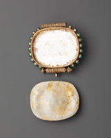 The front of the locket features a wonderfully detailed figure encircled by exquisite filigree designs, which represent the endless essence of wisdom and compassion. The turquoise and coral inlays along the border signify healing energy and good fortune, while the central pattern represents divine presence and guidance. The locket's interior opens into a chamber that has traditionally been used to protect spiritual treasures, making it a highly personal and precious piece.