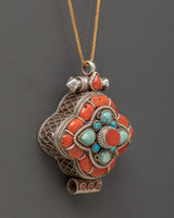 This Sacred Tibetan Ghau Prayer Locket Necklace is a beautifully handmade amulet pendant crafted from sterling silver and adorned with genuine turquoise stones and coral inlays. This magnificent Buddhist prayer box necklace, measuring around 6 cm in height and 5 cm in breadth, is both a striking spiritual decoration and a locket that has traditionally housed mantras, sacred relics, or protective prayers. This Tibetan charm, known as a "Ghau" or "Gau," serves as a spiritual talisman, bestowing blessings and fostering a strong connection to inner serenity, wisdom, and healing. The intricate craftsmanship evokes traditional Tibetan symbology, often associated with chakra balancing, meditation practices, and spiritual awareness.