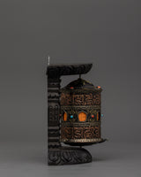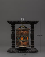 This Sacred Tibetan Spinning Mantra Wheel is a beautiful combination of spiritual symbolism and traditional workmanship. This wheel, crafted from copper, coral, and turquoise stones, is intricately carved from brass and wood, featuring complex designs of the vajra and ghau box. Standing 18.5 cm tall and 17 cm wide, the wheel is precisely designed to store ancient mantras, adding to its spiritual value. The incorporation of a wooden frame provides this ritual item a natural, earthy appearance that complements the Tibetan Buddhist iconography. Whether used for meditation or displayed as spiritual decor, it serves as a potent reminder of the Buddhist traditions' protection, wisdom, and enduring vitality.