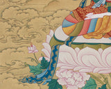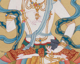 It depicts Vajrasattva as a meditative figure symbolizing peace, purity, and enlightenment. He holds a vajra, representing indestructible wisdom and the transformative power of spiritual teachings, and a bell, symbolizing the wisdom of emptiness and the perfect balance of wisdom and compassion. The moon disc beneath him symbolizes his cooling and healing energy, providing peace and tranquility. His serene expression and posture reflect his capacity to cleanse negative karma, making this artwork a powerful spiritual tool for healing and meditation. The Thangka is made of natural lhasa stone colors and 24K gold, creating a calm and divine presence. It is ideal for meditation rooms, sacred spaces, or personal altars and serves as a constant reminder of Vajrasattva's wisdom and the transformative power of purification and healing.