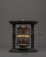 The prayer wheel revolves smoothly within its wooden frame, offering an internal exercise that symbolizes the Dharma's perpetual cycle. Brass detailing adds a touch of spiritual elegance and enduring beauty. This prayer wheel is ideal for individuals seeking inner serenity, practicing regular mantra recitation, or adding meaningful Buddhist decor to their space. It is a timeless tool for mindfulness and sacred aesthetics.
