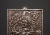 This magnificent Sakya Mahakala Carved Wall Hanging is expertly hand-carved from iron and is 41cm in height and 29cm in width, weighing 1.81kg. The iron body adds hardness and a forceful presence to this holy artwork, making it suitable for use on the walls of your meditation room, shrine, or any other location that benefits from protecting spiritual energy. The exquisitely detailed relief carving adds visual depth and intensity, making it both a sacred item and a dominating work of Tibetan Buddhist art.