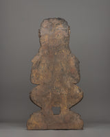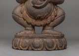 The figurine is seated on a sun disc lotus base, symbolizing his purification and the unfolding of wisdom through his fierce appearance. His dancing posture reflects his dynamic, energetic nature, continually working to destroy ignorance and clear the path for spiritual growth. Mahakala’s form is both fierce and compassionate. He helps practitioners by removing obstacles, allowing them to progress toward enlightenment. This finely crafted statue captures the perfect balance of wrath and compassion, representing Mahakala’s role as a protector and guide in Buddhist practice.