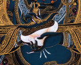 Sakya Mahakala, also known as the Sakya sect's most popular Protector deity. A burning flame behind him conveys his wrathful nature with his upward fire-like hair and large, glazed eyes. He is represented with a wooden gong (Gandhi), a skull bowl, and a vajra holder in his hands, and his right leg is on top of a human face, wearing a five-headed skull crown. He has tiger skin on his body and snake-like ornamentation with a gaped mouth. The wooden Gandhi is used to summon the monks and nuns in the monasteries and is symbolic of his vow to protect and guard the monastic community. He is celebrated and placed in the hearts of all Sakya practitioners in the Himalayan community.