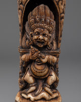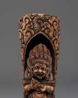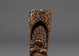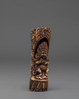 This Sakya Mahakala Stamp is a precious and exquisitely created item used in Tibetan rituals to evoke the protection and spiritual power of Mahakala, one of Tibetan Buddhism's most venerated protector deities. This stamp, which measures 13cm in height and 4cm in breadth, and weighs only 0.12kg, is made from ethically sourced Buffalo Bone, ensuring both spiritual integrity and environmental conscience. Mahakala is recognized for his wrathful but sympathetic character, which protects practitioners from obstacles and harmful energies. This ritual stamp is intended to seal prayers, mantras, or sacred texts, endowing them with Mahakala's protective blessings.