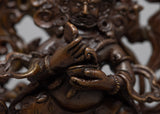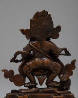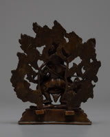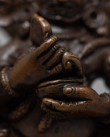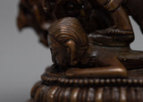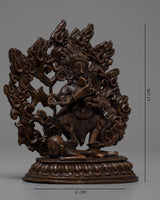 Our statue of Protector Deity, Sakya Mahakala sculpture is handcarved in oxidized copper body and acrylic colours. You can use this piece of art for different Buddhist rituals and regular practices such as meditation.