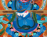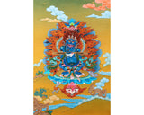 Sakya Mahakala, the dharma protector(guardian) of the Sakya sect, is depicted in his Panjaranatha form in this thangka. Here, he is carrying a wooden gong(Gandhi), skull bowl and vajrahopper. The wooden Gandhi is used to summon the monks and nuns in the monasteries and is symbolical of his vow to protect and guard the monastic community. He is celebrated and placed in the hearts of all Sakya practitioners in the Himalayan community.