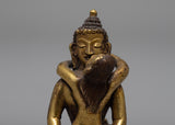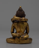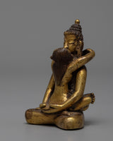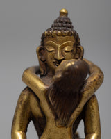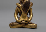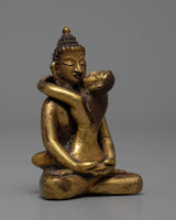 The statue's body was carved in oxidized copper and gilded in 24k gold. We utilized lovely acrylic paints to bring the statue to life. The Buddhist Bodhisattva is seated in a meditative position, his legs folded. His consort is sitting on his lap, her arms around him.