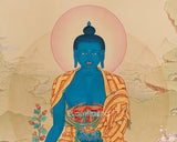Immerse yourself in the profound healing energy of Sangay Menla, the Medicine Buddha, with this meticulously created Thangka. Sangay Menla is revered in Tibetan Buddhism as the Supreme Healer, embodying the healing power of all Buddhas. His deep blue body, radiating with the color of lapis lazuli, symbolizes the ultimate nature of healing—calm, compassionate, and boundless. In this Thangka, Sangay Menla is depicted holding a bowl of medicinal nectar in his left hand and the myrobalan plant in his right, both symbols of his ability to cure all forms of suffering, whether physical, mental, or spiritual.