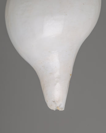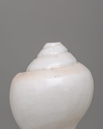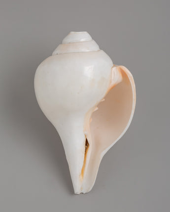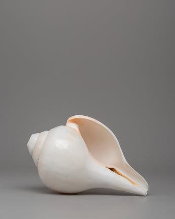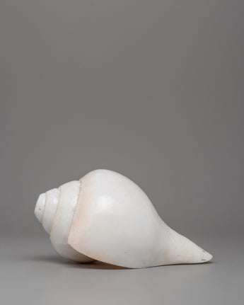 This conch shell (sankha) is a stunning example of natural craftsmanship. It measures 13 cm in height and 19 cm in width and weighs 0.986 kg. The shell has been carefully polished, giving it a smooth, shiny finish that enhances its natural ivory color. Its spiral design is symmetrical, gracefully expanding from the pointed tip to the wider opening. This conch shell has an elegant, rounded body and a well-defined lip, giving it a timeless aesthetic appeal.