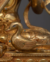 The intricate patterns on Saraswati's robes and the expressive features on her face and hands are just a few examples of the careful detail that went into creating this statue. The sculpture has been given elegance and spiritual meaning by the artists' thorough attention to detail. The gold plating highlights the artists' fine skills in addition to symbolizing Saraswati's spiritual essence. For individuals looking for a work of art that captures the spirit of inspiration and knowledge, this statue is ideal.