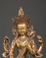 This Saraswati Goddess Statue in Copper depicts the respected Hindu deity of wisdom, music, and the arts. This sculpture is 35 cm tall, 24 cm broad, and weighs 4.67 kg. It is crafted of copper and elegantly gold-plated for a vibrant, magnificent finish. Saraswati is shown in a tranquil reclining position, holding her customary veena (stringed instrument), mala (prayer beads), and scripture, representing the harmony of intellect, creativity, and spiritual understanding. Her peaceful expression, delicate hands, and flowing robes exemplify the elegance and purity of Hindu heritage.