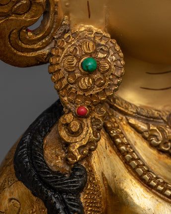 Introducing our handcrafted Saraswati Hindu Goddess of Knowledge, art, music, and learning, having a base measurement of 10.4 inches and a height of 14.4 inches. This 4.97 kg artwork has a copper body and is exquisitely decorated with gold electroplating, detailed acrylic and gold paints, and vivid gemstones, which pays attention to the rich legacy of Nepalese metalwork. This statue is dedicated to Saraswati's role in promoting creativity, knowledge, and wisdom, and is decorated with intricate craftsmanship and amazing materials, demonstrating her profound symbolic meaning.
