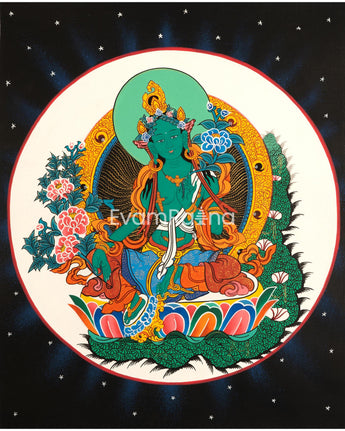 Green Tara, a revered figure in Tibetan Buddhism, symbolizes compassion, swift action, courage, wisdom, and suffering alleviation. Devotees seek her protection and guidance through her mantra, "Om Tare Tuttare Ture Soha," invoking her blessings for overcoming obstacles and liberation.